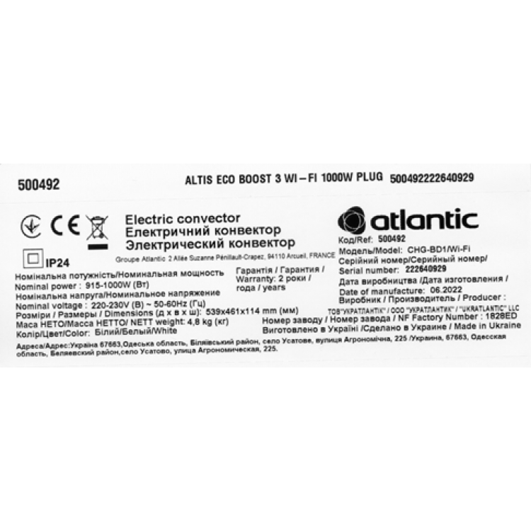 | Характеристики конвектора Atlantic Altis Eco Boost 3 Wi-Fi CHG-BD1/Wi-Fi 1000W | |