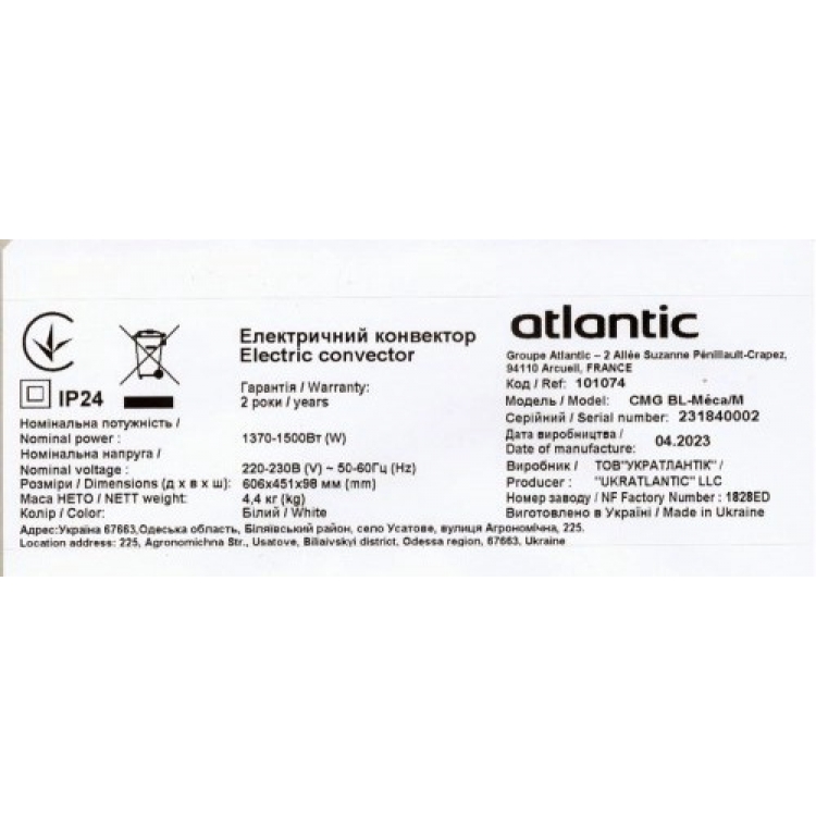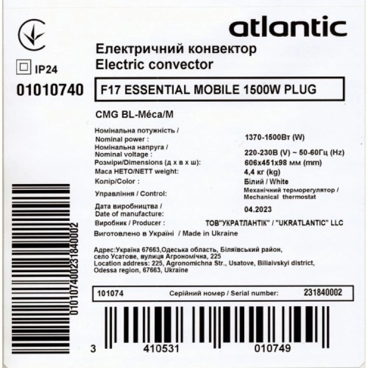 | Характеристики конвектора Atlantic F17 Essential Mobile CMG BL-Meca/M 1500W (101074) | |