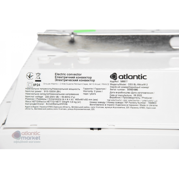 Характеристики конвектора Atlantic F19 CEG BL-Meca/M2 1000W