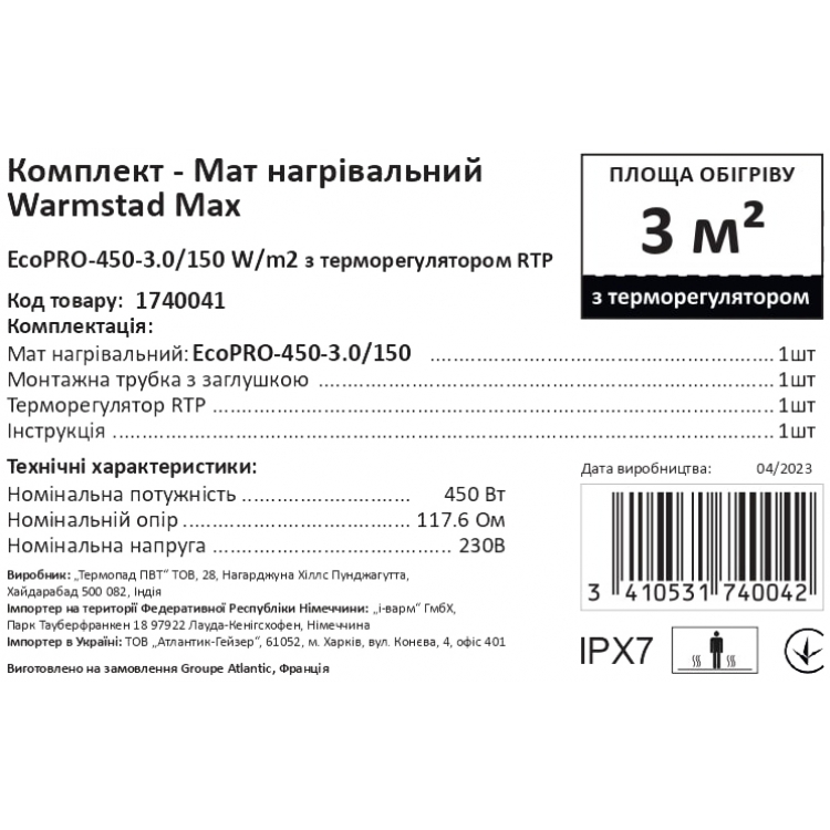 Характеристики Warmstad Max EcoPRO-450-3.0/150 W/m2
