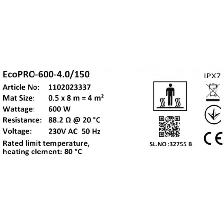 Характеристики Warmstad Max EcoPRO-600-4.0/150 W/m2 с терморегулятором RTP