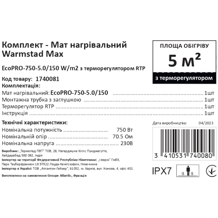 Характеристики Warmstad Max EcoPRO-750-5.0/150 W/m2