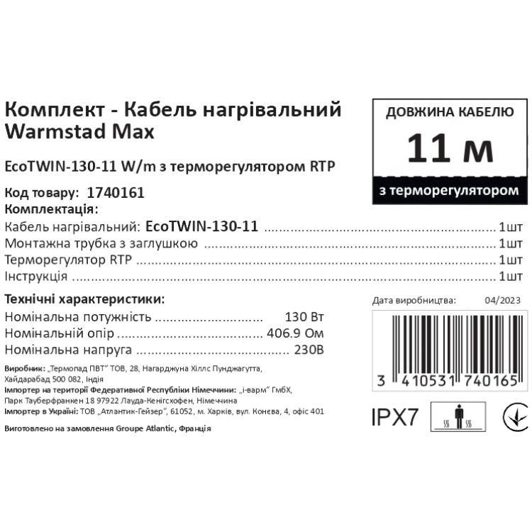 Характеристики Warmstad Max EcoTWIN-130-11 W/m с терморегулятором RTP