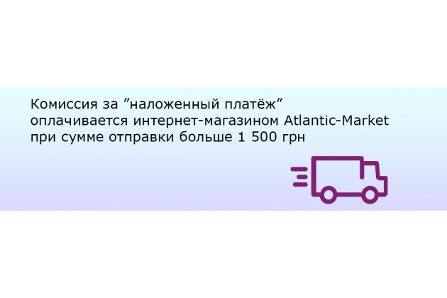 Комиссия за ”наложенный платёж” оплачивается интернет-магазином Atlantic-Market при сумме отправки больше 1 500 грн