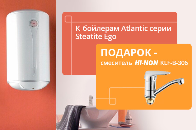 При покупке бойлеров Atlantic серии Steatite Ego Вы получаете однорукий смеситель HI-NON KLF-B-306 в подарок.