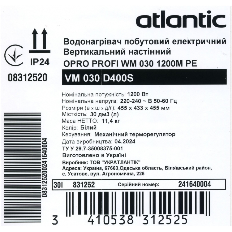 | Характеристики водонагревателя Atlantic Opro Profi VM 030 D400S (1200W) | |