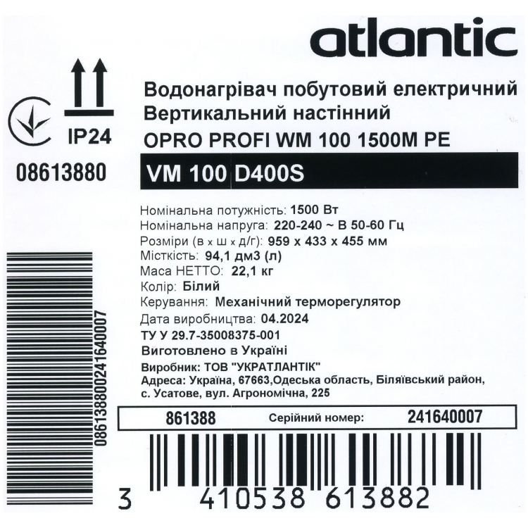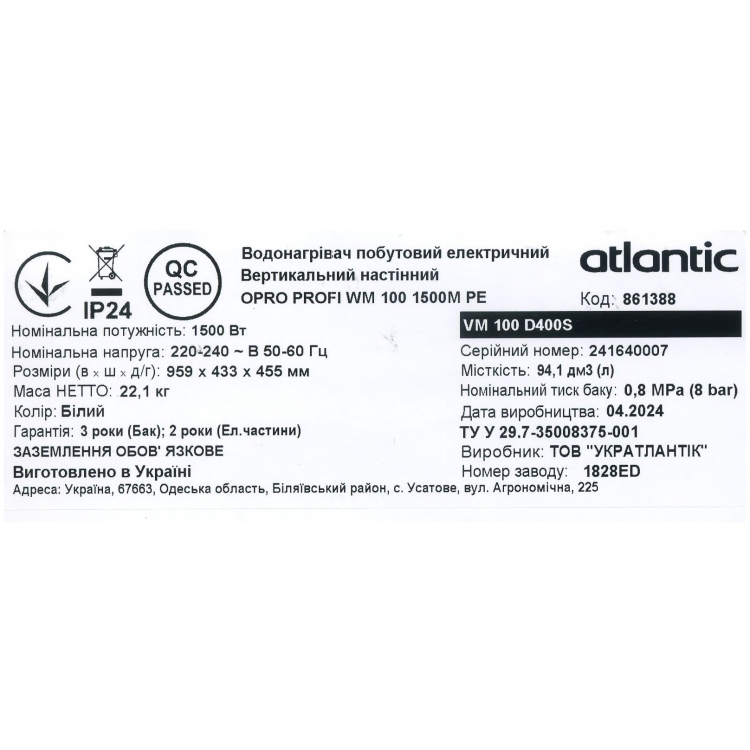 | Характеристики водонагревателя Atlantic Opro Profi VM 100 D400S (1500W) | |