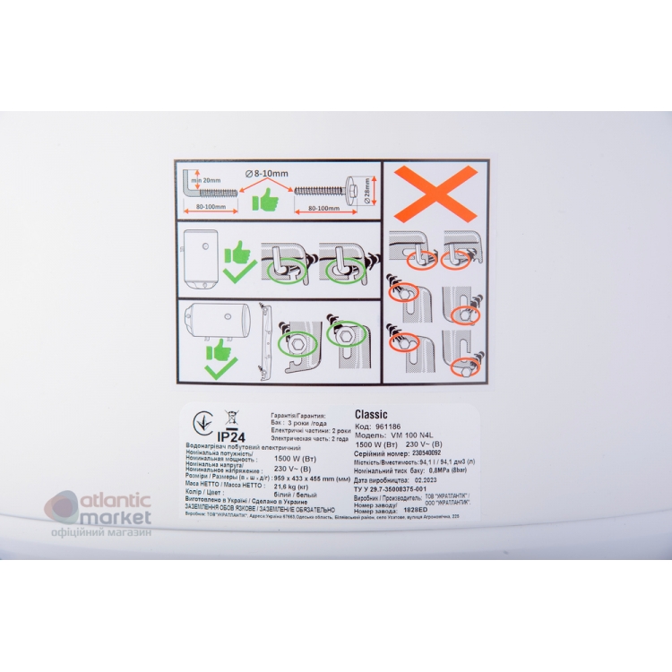 | Характеристики водонагревателя Classic VM 100 N4L (Atlantic) | |