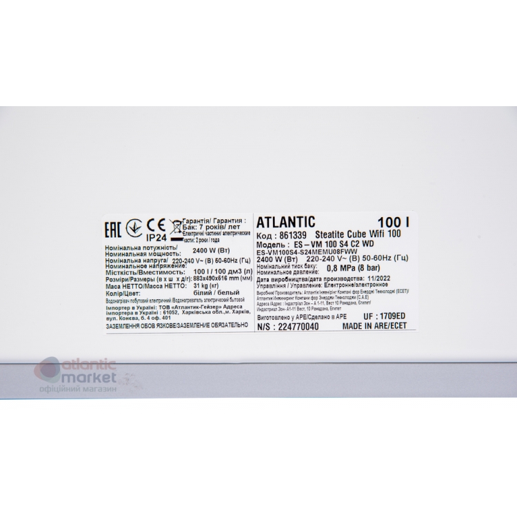 Характеристики Atlantic Steatite Cube WI-FI ES-VM 100 S4 C2 WD (2400W) white